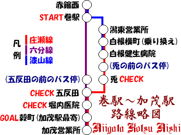 これに乗って白根横町バス停まで行き、兎経由の加茂行き(庄瀬線)の最終便に乗りかえる…