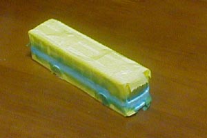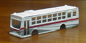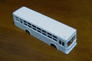 接着した境目を外側からエポキシパテで埋めます。 このとき、絶対にパテを付け過ぎないようにします。あくまで接着面の溝を埋めるだけの量にしましょう 固まったら例によって紙やすりで仕上げます。(省略可、ただしリアルさが犠牲となります) ついでに、屋上機器(クーラー等)を接着します。(説明書および実際のバス参照) |
