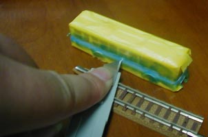 つぎに、色を載せる部分のマスキングを剥がします。 カッターナイフで乾いたマスキングゾルに筋をつけ剥がしていきますが、まっすぐな線を作るには少々コツが要ります。 写真のように、カッターの刃を一定の高さに固定し、バスの車体を滑らせるとまっすぐな線を作ることが出来ます。 また、マスキングゾルを剥がす際にまっすぐ出来なかったり、ドアの段差などで必要な部分まで剥がれてしまったりする事があります。そのときは一旦全部剥がすか、マスキングゾルを上塗りして最初からマスキングをやり直します やり直しが効く失敗は、素直にやり直しましょう |