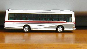 仕上げその2 筆で塗装する個所は、バンパー(銀),ホイール(白),ヘッドライト(銀)&ウインカー(銀の上に透明橙色)&バックライト(銀の上に透明赤),ヘッドライト枠,ワイパー(黒) これらは所有バス会社によって違います。実物を見て色を選択しましょう。 |