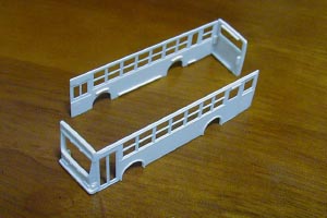 ここでは、“グリーンマックス”社製の“いすゞキュービックバス前後扉”(2台入り¥1,000)を組み立て、“常磐交通”のバスを作りたいと思います。何故“常磐交通バス”かと言うと、私が一番気に入ってる模様のバスだからです。それ以上の理由はありません。(笑) では始めます。 |