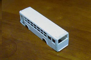 側板が乾いたら、それらを箱型に組み、屋根も接着します。 屋根パーツにはあらかじめ通風機が成型されていますが、このバスには必要ないので全て削ります。彫刻刀で削り、紙やすりで仕上げる(省略可) これでバスらしくなってきました。 |