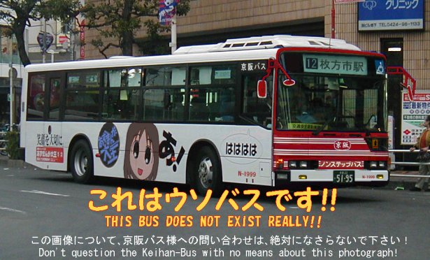 あ!はははは(大阪バージョン) ちよバスならぬ大阪バス 元ネタ知らないとチトきついか?(改造前の画像) (撮影場所:京王電鉄調布駅北口) サブタイトルは【世界一おめでたいバス停“上矢部”へようこそ!】 |