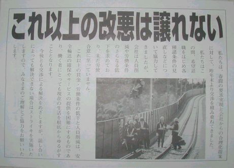 ![]() バスの窓に掲示されていたスト決行を知らせるチラシです。 このチラシは、駅の至るところにも貼付されていました。 |