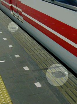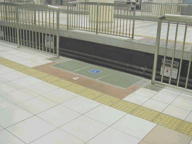 No.12 最終段階 電車の車椅子スペースの乗り口(先頭から数えて4つ目)の ホーム際には、スレッドラインはなく、リモコン式の 車椅子用スロープ(ラクープ)が用意されています。 撮影:2001/7/1(日) |