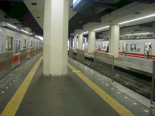 No.5 第4段階 もう1ヵ所にも柵が取り付けられました。 今回は降車専用ホームの2番線側です。 他のホームにも順次取り付けられる予定です。 柵取りつけ前の写真を右に用意しました。 比較してみましょう(^^) (←)撮影:2001/4/9(月) (→)撮影:2001/4/4(水) |