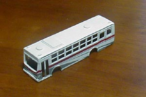 接着した境目を外側からエポキシパテで埋めます。 このとき、絶対にパテを付け過ぎないようにします。あくまで接着面の溝を埋めるだけの量にしましょう 固まったら例によって紙やすりで仕上げます。(省略可、ただしリアルさが犠牲となります) ついでに、屋上機器(クーラー等)を接着します。(説明書および実際のバス参照) |