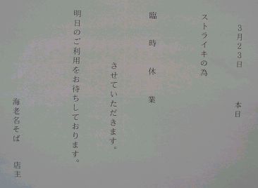 ![]() バスの窓に掲示されていたスト決行を知らせるチラシです。 このチラシは、駅の至るところにも貼付されていました。 |