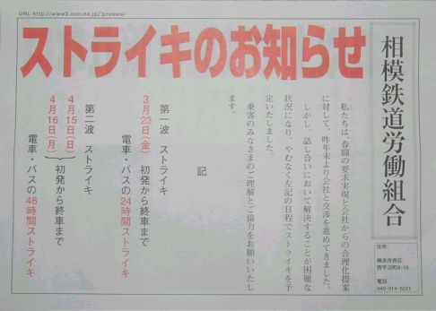 | このストライキについて、車内放送で説明がありましたので、 録音(爆)をしてきました。(MpegAudio-186KB) ・放送内容・ 「(前略)ご利用の皆様にお知らせを致します。 相鉄労働組合では春闘要求の実現と、人員削減・労働条件の低下などの 改善などについて交渉を行っておりますが、解決できない場合は やむなく、3月23日に電車・バスのストライキを実施致します。 皆様のご理解とご協力をお願い致します。」 |