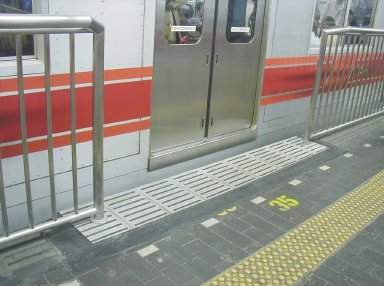 No.12 最終段階 電車の車椅子スペースの乗り口(先頭から数えて4つ目)の ホーム際には、スレッドラインはなく、リモコン式の 車椅子用スロープ(ラクープ)が用意されています。 撮影:2001/7/1(日) |